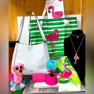 kate spade new york Leila Pebbled Leather shoulder bag in EUC she retails for $339 there is a light pen mark inside that im sure can come off you also will get the striped flamingo tote the pink Kate spade card holder the flamingo drink float or the flamingo dish towel the Betsey Johnson flamingo necklace the flamingo earrings and the adorable Ty beanie flamingo!