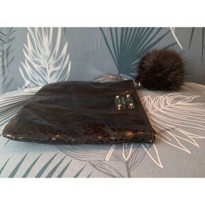 Kate Spade black Snake Skin Clutch Purse Handbag FUR ZIPPER PULL