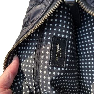 Kate Spade black nylon shoulder bag with distinctive circular quilted stitching, a top zip closure, end a single strap. The lining is black with white polka dots. A zipper inner pocket and 2 inner unsecured additional pockets. This purse has been authenticated.