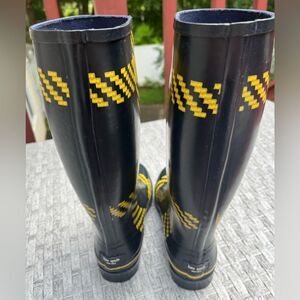 Kate Spade black, tall, rubber, boots, yellow trim, and pattern throughout, 8
