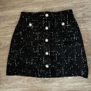 Kate Spade size 2 mini skirt, embellished black tweed with pearl buttons. Holiday 2020.
