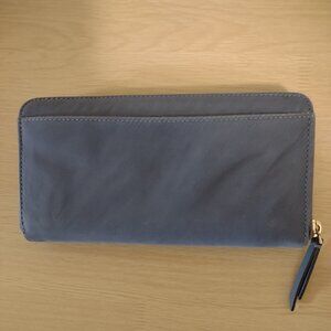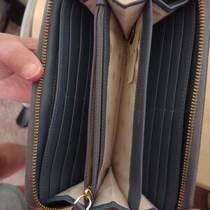 This is a Kate Spade blue wallet measuring 8" x 4" It has a zipper on the outside and one on the inside. It has a large pocket on the back and four large pockets on the inside, as well as 12 small pockets on the inside. It is in very good condition.