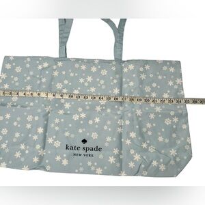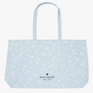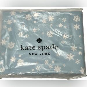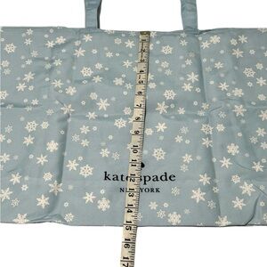 -Lightweight fabric reusable shopping tote with soft blue base color and beautiful white snowflake print and Kate Spade logo.