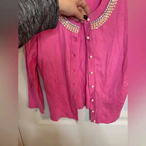 Kate Spade, pearl beaded cardigan, Tula, size medium, excellent condition, pink/ magenta, white, 3/4 length sleeve