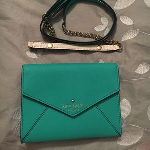 Kate Spade green (bright beryl) Monday leather cross body bag ; envelope style. Removable straps so it can be worn as a clutch. 5" X 6.5" X 1" in excellent condition, doesn't appear to have ever been used