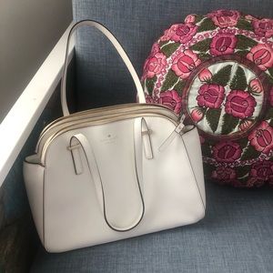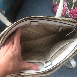 Gently used, classic white bag. Small wear on strap (in picture) and blue ink stain on inside (pictured)