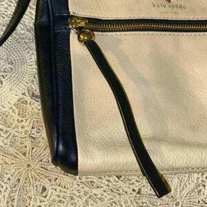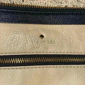 Kate Spade cream & black pebbled leather crossbody with gold hardware. In fair pre loved condition. There is a tear in the bottom of the lining in the front zipper pocket, but the rest of the bag is in great shape. Measures 9” x 8” with a 50” long adjustable strap.