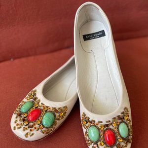These flats are in good condition. The brand speaks for itself!! Cream color leather upper and soles. This flat will accommodate chic causal.