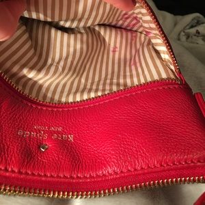 Red shoulder bad has been used the only damage is on the inside of the from pocket and it's a pink stain and it's not noticeable