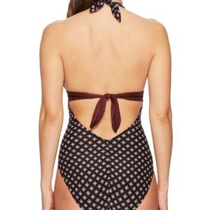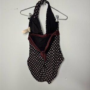 Chic swimsuit featuring a black and white geometric design. Maroon accents add a stylish touch. Perfect for a fashionable beach day.
