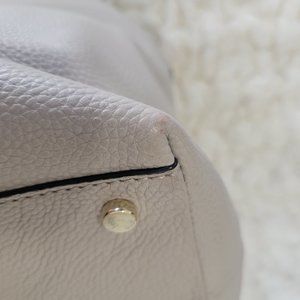 The color is a warm gray/beige, the pink stipe makes it stand out. The edges are in perfect condition.