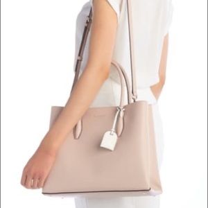 For casual outfits, a less structured satchel is a great option and will still look classy. - Dual rolled top handles - Detachable, adjustable shoulder strap - Open top - Exterior features metal feet, pebbled leather construction, and removable tag - Interior features center zip divider - Approx. 10" H x 13" W x 5" D - Approx. 8" handle drop, 16-20" strap drop - Imported