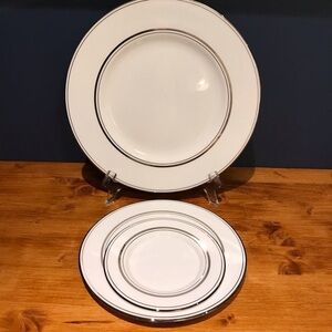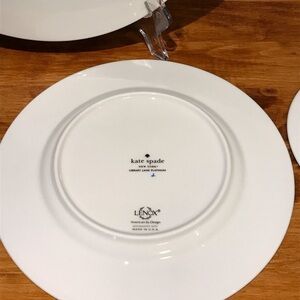 Kate Spade by Lenox 3 piece place setting. The pattern name is Library Lane Platinum. It has the saucer, salad plate and dinner plate. Like new condition some still have price stickers.they are white with silver( Platinum) trim.