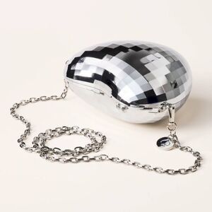 This metal, heart-shaped bag has a silver disco-ball inspired exterior shell, plus a bright fabric lining, magnetic closure and removable metal shoulder strap. Very unique and pretty bag. Sold out at Target as of this listing. Let me know if you have any questions! Bundle and save, and please note that I reuse shipping materials whenever possible ♻️