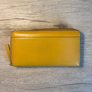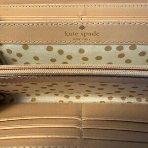Kate Spade yellow full size leather wallet. Lots of card holders and an internal zip for change. Gold polka dots on the inside and the zipper works great. Just needs some leather cleaner to freshen it up.