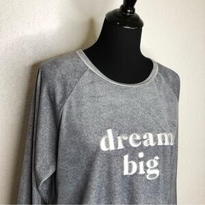 Kate Spade gray DREAM BIG embroidered velour top. Pullover style with crew neckline. Embroidered lettering on front. Side slit hemline. Size XL. Excellent preowned condition. Minor wash wear and minor wear to embroidery. Polyester elastane blend. Machine wash.