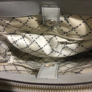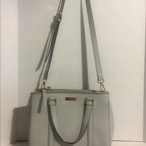 Authentic Kate Spade grey cow leather crossbody handbag with gold tone hardware 3 compartment 3 pockets at exterior wall 1 zip closure & 2 zip closure 1 snap closure at top exterior poly lining , lining have mirror stains interior have mirror marks double handles protective metal foot base please check all photos hight 8.5” width 10.5” depth 4.5” Strap drop 5” shoulder strap 28” adjustable 2 snap at side