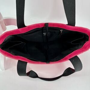 Large canvas tote bag in hot pink. Perfect for a picnic. Black canvas handles and black fabric lining. Flat fake leather base.