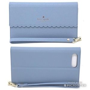 New with tag & foam padding Kate Spade Folio Wristlet with 2 card slot & attached phone case. Color is "cloud cover" (light blue), insert fits with iPhone 7 or 8 Plus. Leather body, polyester lining, silver hardware, scallop edge & magnetic closure. Dimensions are 6.5" L, 3.5" W & 1" D