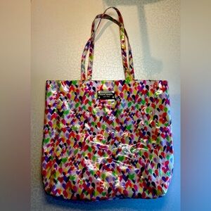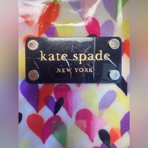 Women’s Kate Spade Daycation tote bag. PVV, slick and shiny exterior. Fully lined. One pocket on the interior. 2- shoulder straps. Traditional Kate Spade logo plate on the front of the handbag, it has some scratches - see picture. Vibrant colors. There are some very tiny cracks on the top of the bag- see pictures. Used condition. This is a Kate Spade sample bag.