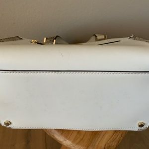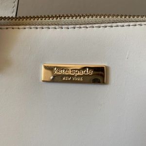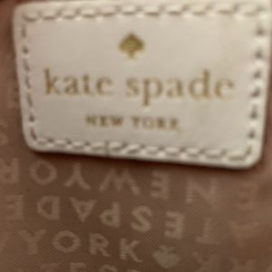 Kate Spade satchel with removable shoulder/crossbody strap. Gold-toned hardware. Exterior zippered pocket. Interior includes two pockets and a zippered compartment. 14" x 9" x 6 1/2". Minor scuff marks on bottom of bag. See photos.