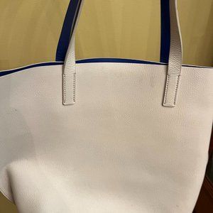 white/cream shoulder tote with royal blue leather inside. Inside zip pocket.