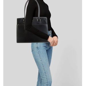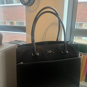 This Kate Spade leather tote is perfect for work and is in great condition. It comfortably holds a 16" inch laptop with a lot more! On the inside, it contains a small pocket on one side and on the other, two smaller pockets for a phone or sunglasses. There are two pockets on the outside of the front. One is the zipper compartment, and the other is a large pocket between the zipper pouch and the bag that closes with a button.