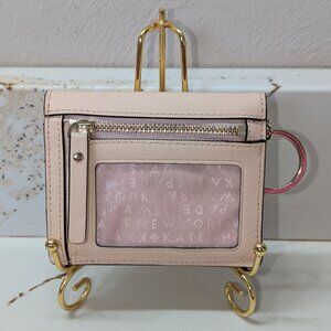 Kate Spade peach mini wallet with key chain has one ID slot, 5 card slots and zip pocket for your coins. Pretty shade of peach has a small spot on the front of the wallet, and the face plate is slightly scratched. Overall, this wallet is in great condition.