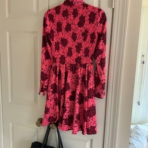 Pink printed crepe (100% Polyester). Hourglass. Long sleeves. Shirt collar neckline. Exposed front button down placket