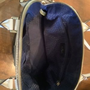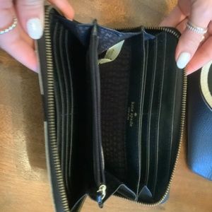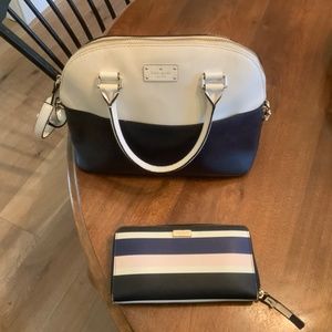 Kate Spade purse and wallet combo. Color is dark blue/ white on bag. Clutch is blue/white/pink/black . Clutch is slightly used, but bag is excellent