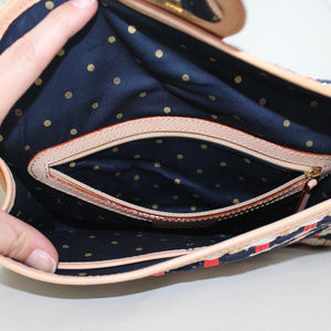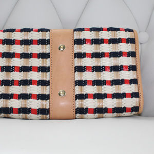 Kate Spade Plaid Woven Clutch. Approx. 9.5"L x 6"H x 2.5"D. Woven Raffia and yarn with tan leather trim. Gold tone hardware. Some wear overall with scratching on the hardware and light marks on the leather.