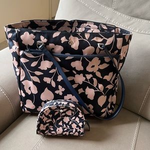 Kate spade set, never used, beautiful nylon material bag with makeup bag. Navy blue strap color.