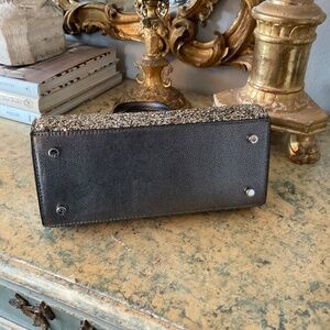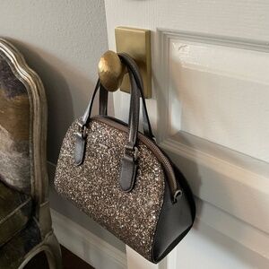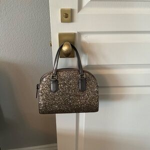Kate Spade silver glitter bag. 9.5” wide, 7.5”, 4” wide. 5” high handle unsure if the trim is man made or leather? Does not say inside.no long strap.