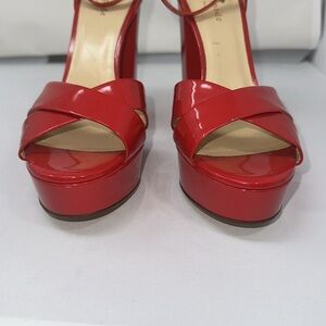 Preowned. Kate Spade red Patton, leather chunky heels. Heel height is 5 inches. Notice black mark on inside of left heel as pictured notice scuff on right heel back as pictured. Noticed small black mark on outside of left shoe as pictured. Please examine photos carefully the best description of these shoes being sold. Feel free to message me with any questions or offers.