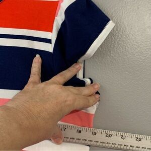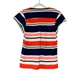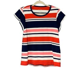Kate Spade multi striped flutter sleeve scoop neck knit top in navy, salmon, white and orange. Tags: comfy, soft, casual, loungewear. Size M