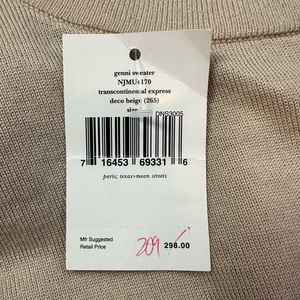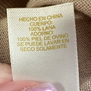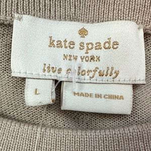 Kate Spade size L NEW WITH TAGS knit top Style tag says “Deco Beige” and dark brown leather accents. Great condition besides one small hole that can be easily fixed or tucked in. 100% wool with 100% sheep skin leather details. Long sleeve thin knit pullover. Sheer. Bow detail.