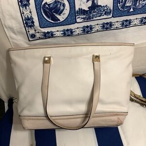 Beautiful tote bag in color block, white and beige has gold tone, hardware, beautiful pebbled, leather inside has one zip pocket to slip pockets in good Preloved condition has a few corner rubs on bottom no rips, or tears