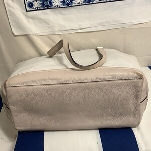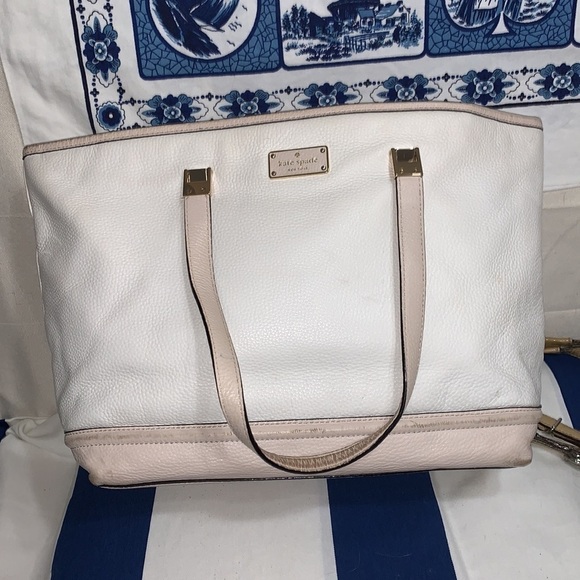 Beautiful tote bag in color block, white and beige has gold tone, hardware, beautiful pebbled, leather inside has one zip pocket to slip pockets in good Preloved condition has a few corner rubs on bottom no rips, or tears