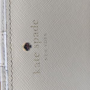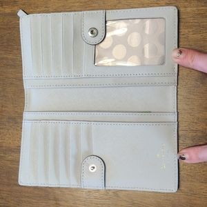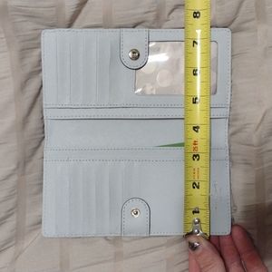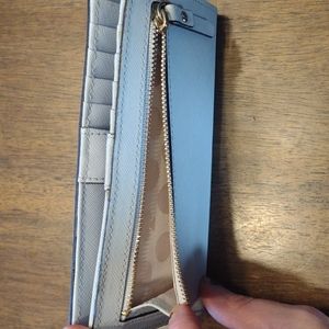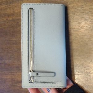 hardly used, looks New! warm grey. zipper on back. several card slots and pockets inside with ID window. no scratches, scuffs, stains.