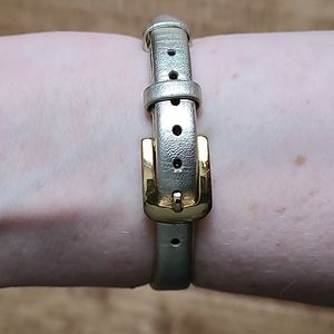 kate Spade analog watch with gold hardware, round 30 mm face and shimmery gold 10 mm leather band