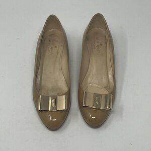 Kate Spade women's shoes, size7B. Low wedge. Taupe/tan patent leather with gold bow at toe. Almond toe. Gently worn, in very good used condition. A few minor scuffs on uppers and bows. Noticeable wear to soles. See photos. Classic, neutral style. Very cute!