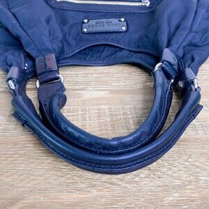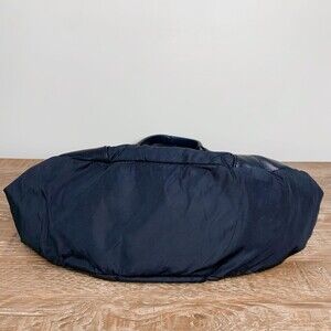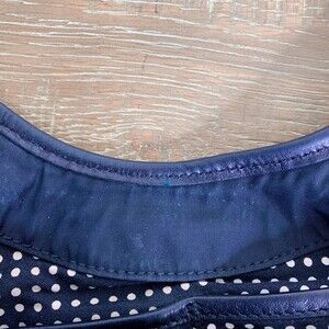 DETAILS: Vintage bag was purchased in early 00s; nylon fabric exterior with leather trim; 8" leather drop handles; gold hardware; interior polka dot print lining; stamped patent leather logo on front; inside zipper pocket; double inside compartments with zipper pocket divider; exterior zipper pocket on front; number and holographic strip on inside pocket