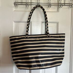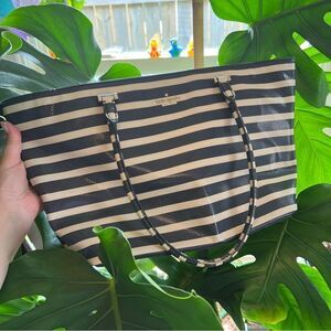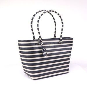 This stylish tote from Kate Spade showcases a nautical-inspired design with bold cream and blue stripes, perfect for beach outings or casual shopping trips. Crafted from durable materials, it features rope-style handles that enhance its maritime charm while providing comfort and ease of use. Its spacious interior makes it a practical choice for carrying all your essentials.