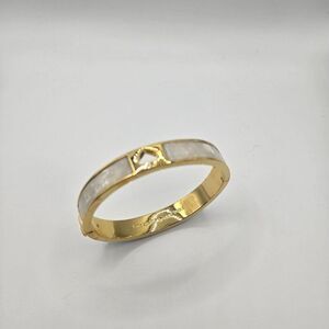 This elegant gold-tone bracelet features a mother-of-pearl inlay and a delicate heart detail, offering a sophisticated touch to any wardrobe.