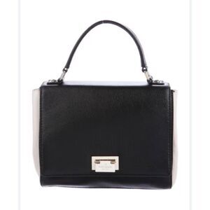 Kate Spade black and cream leather color block pattern satchel bag with gold tone hardware and adjustable/removable shoulder strap. Has front flap lock closure on cream plate. Logo jacquard black/white lining with zipper pocket and 2 slip pockets at interior walls. Bottom protective feet. Minor scratches on gold plate otherwise in pristine condition. EUC