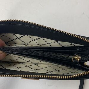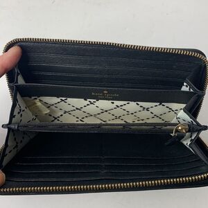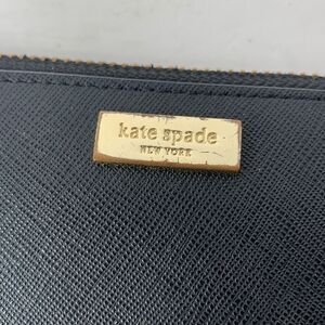 Kate Spade black leather zip-around continental wallet with rear slip pocket and gold tone logo plate on front. Interior features middle zip pocket, 16 card slots, 2 bill slots. Interior is immaculate, only visible wear is scratches on front logo plate.