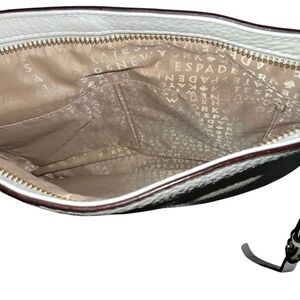 Bone color pebbled leather Kate Spade New York Perri Lane Reidy crossbody bag with gold-tone hardware, single adjustable flat shoulder strap, single exterior zip pocket with perforated panel at front, tan logo jacquard lining, three pockets at interior walls; one with zip closure and zip closure at top.
