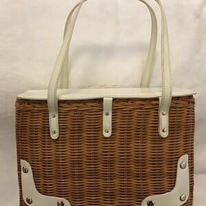 This picnic inspired bag is super fun. The bag embodies summer time elegance. With a purple plaid interior. It has a timeless top handle design. The White patent leather has minor scuffs as shown in photos. Metal engraved logo and clean interior.