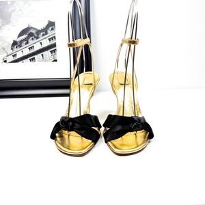 Step into luxury with these stunning Kate Spade New York gold and black bow heels, size 6.5 (EU 37). Crafted in Italy, these elegant heels feature a shimmering gold leather design with a chic black bow accent, a delicate ankle strap, and a sleek stiletto heel. Perfect for weddings, parties, or any occasion where you want to add a touch of glam to your look.