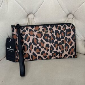NWT wristlet by Kate Spade. Features a sleek design with an exterior slip pocket and a wrist strap. Perfect for carrying essentials.